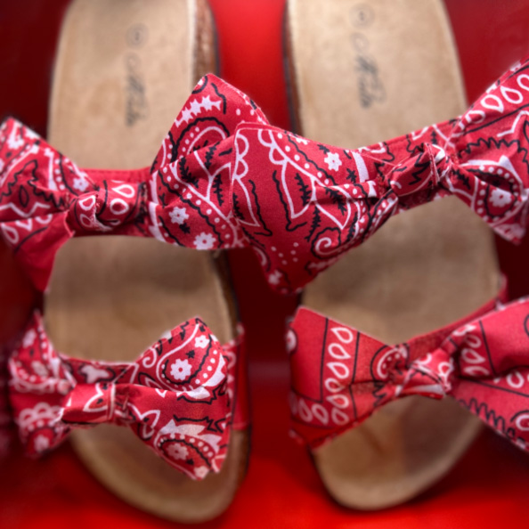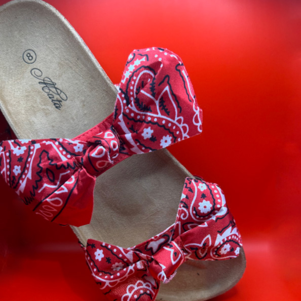 Step into effortless style with these Women’s Red Bandana Bow Sandals. Featuring a soft cushioned footbed and trendy double-strap design, each strap is adorned with a bold bandana-print bow for a playful yet fashionable look.