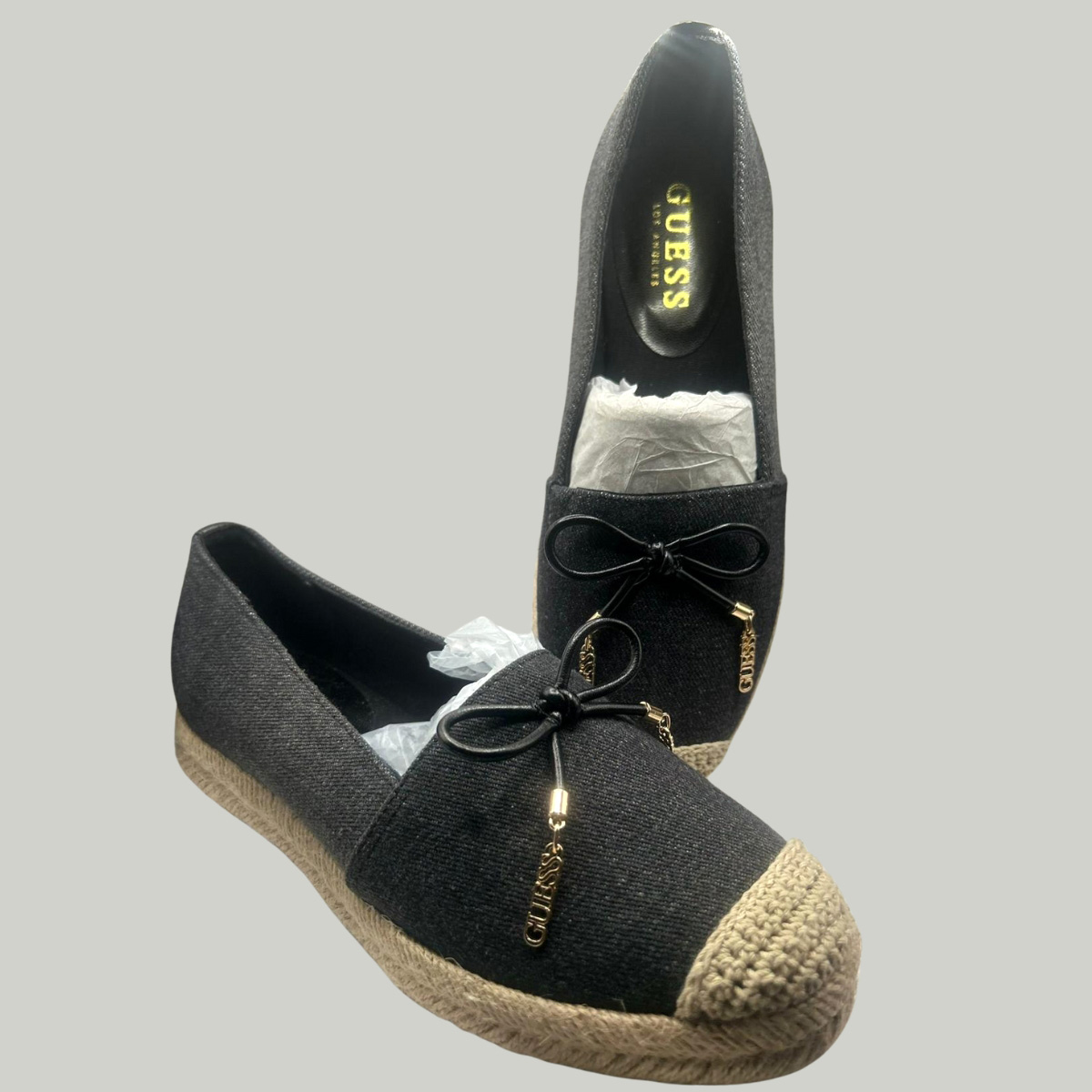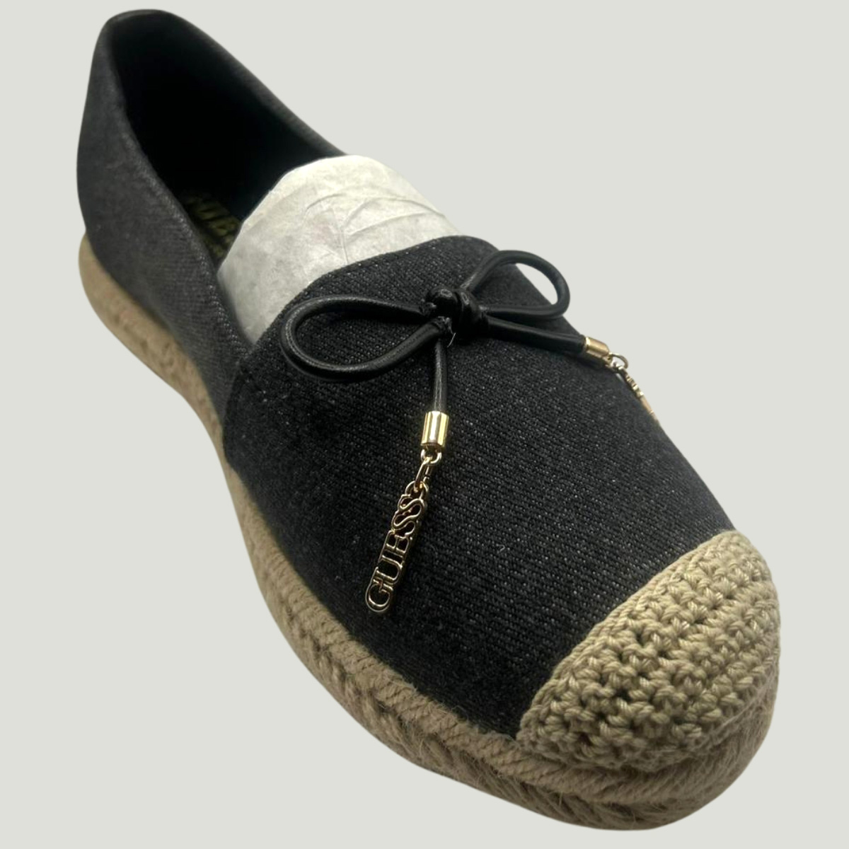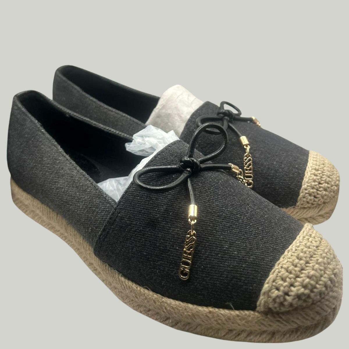 Step into timeless casual elegance with the GUESS Women’s Black Espadrille Flats. Designed with a sleek black fabric upper and signature espadrille-style woven sole, these shoes combine comfort and chic design. A delicate bow with metallic GUESS logo charms adds a stylish finishing touch.